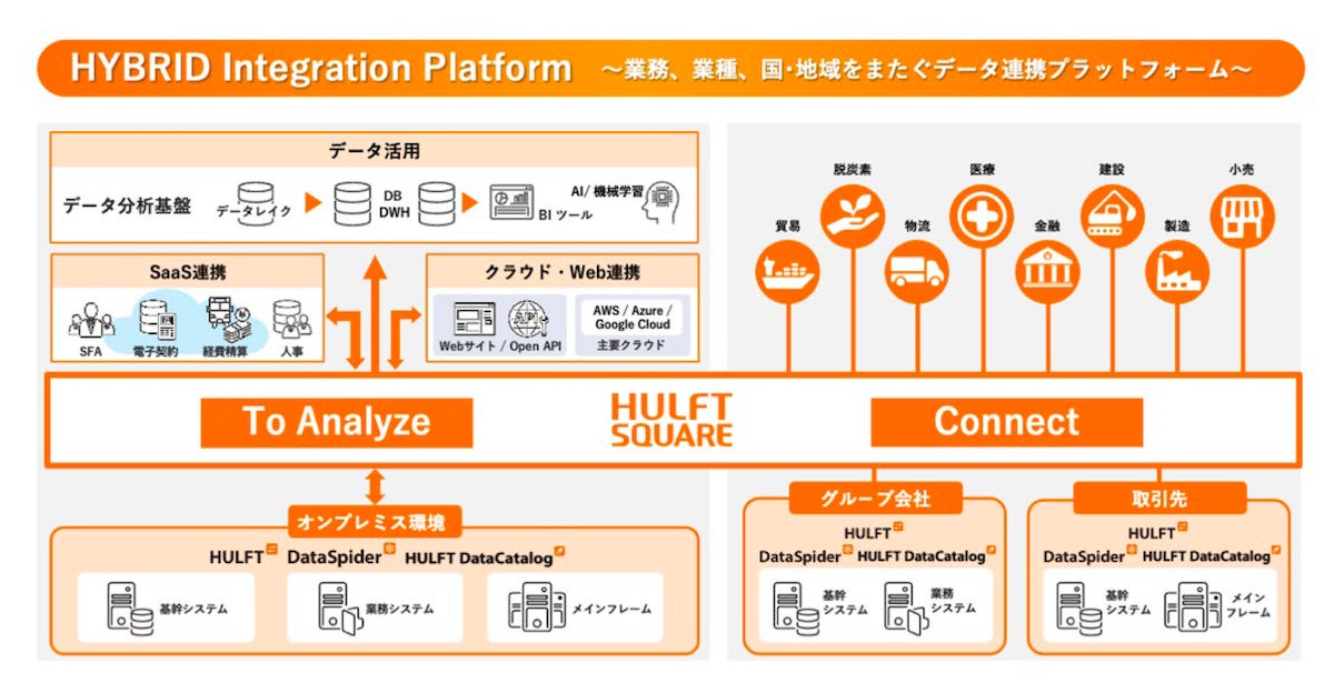 HULFT Squareは、DX実現に必要な「データ活用するためのデータ準備」や「業務システムをつなぐデータ連携」を支援する日本発iPaaS(クラウド型データ連携プラットフォーム)です。オンプレミス・クラウド・SaaSなどの環境に分散し管理されているさまざまなデータを、業務システム間、業種、国・地域をまたぎデータを連携させることができます。