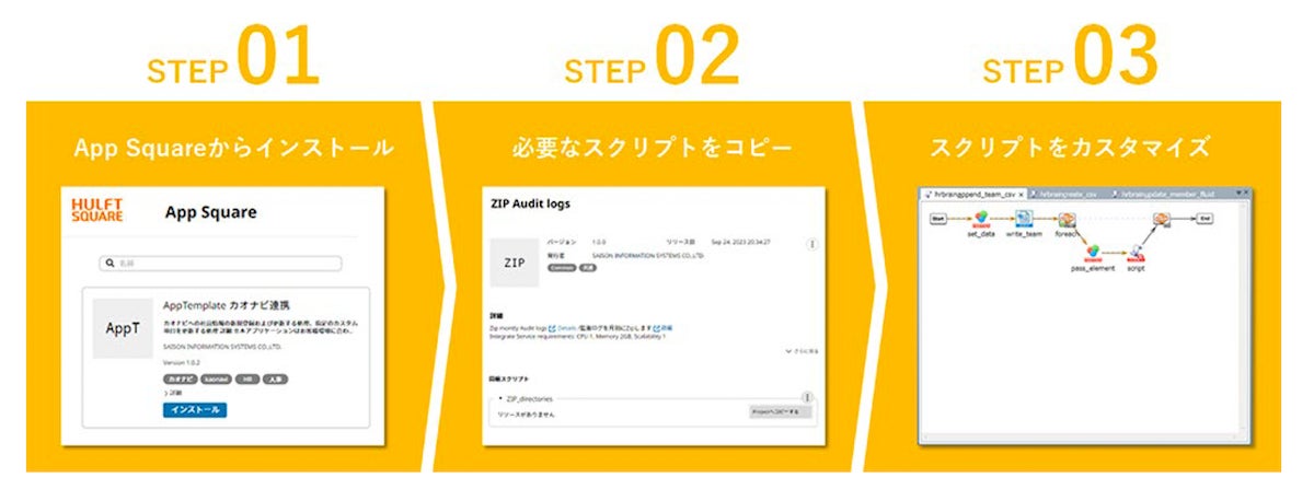 このテンプレートを利用することで、自社のニーズや環境に合わせてのカスタマイズや作成したスクリプトの部分活用など、業務改善の効果をすぐに得られます。動かしながら学ぶサンプル教材として、スクリプト開発の学習にも利用いただけます。このテンプレートは、HULFT Squareを契約中のすべての方が追加料金なしで利用可能です。