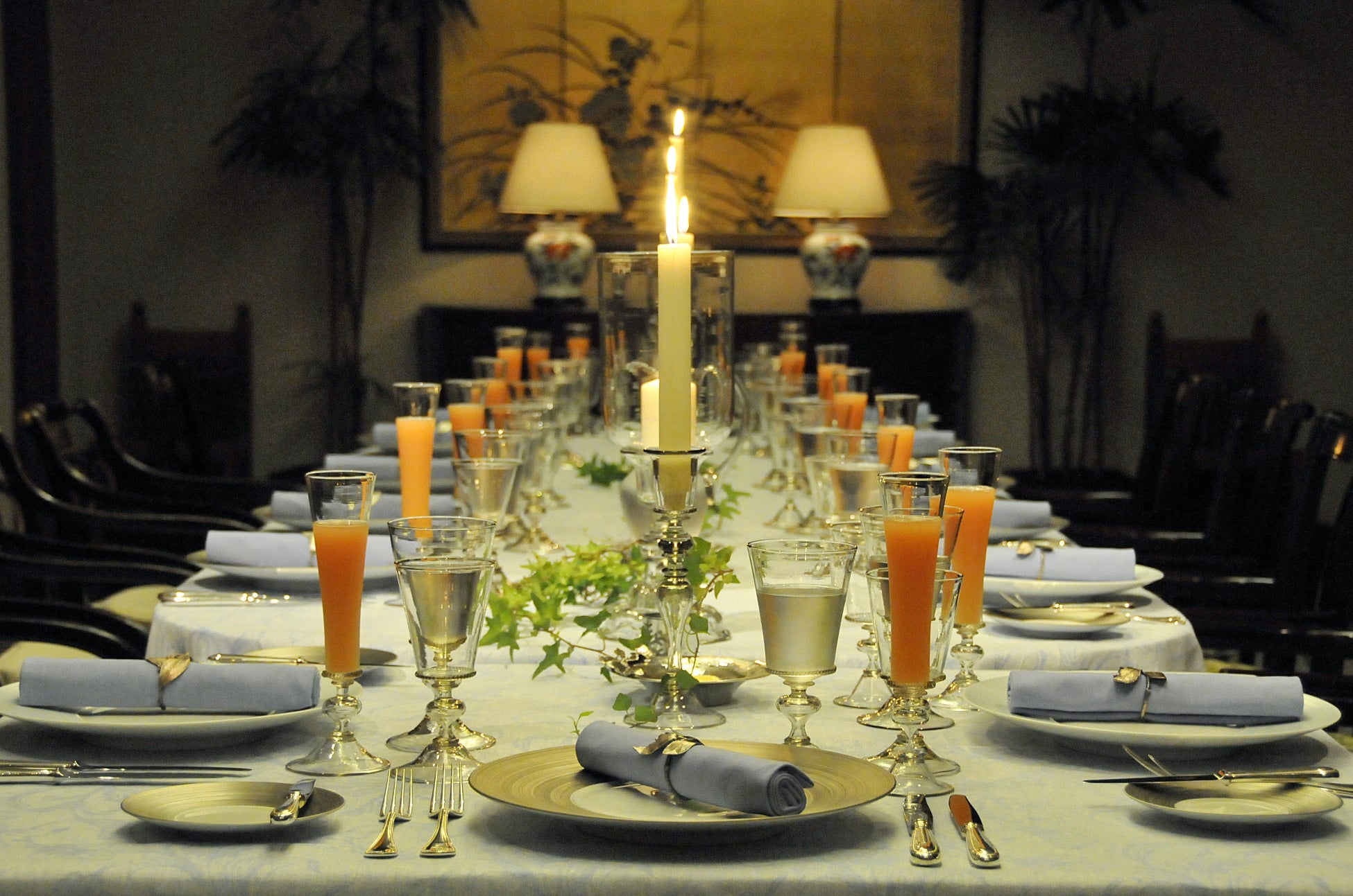 赤々と燃える暖炉の温かさ、ふんだんに生けられた生花の香り、ステンドグラスを通して差し込む森林の息吹き。赤とブルーを基調としたベーカーファニチャー社の家具やクーパー社の照明が配置され、心地よい安らぎの空間が広がります。まるで、美しい森に囲まれたヨーロッパのマナーハウスのような雰囲気の中で、お好みの特等席で旅の疲れを癒していただけます。