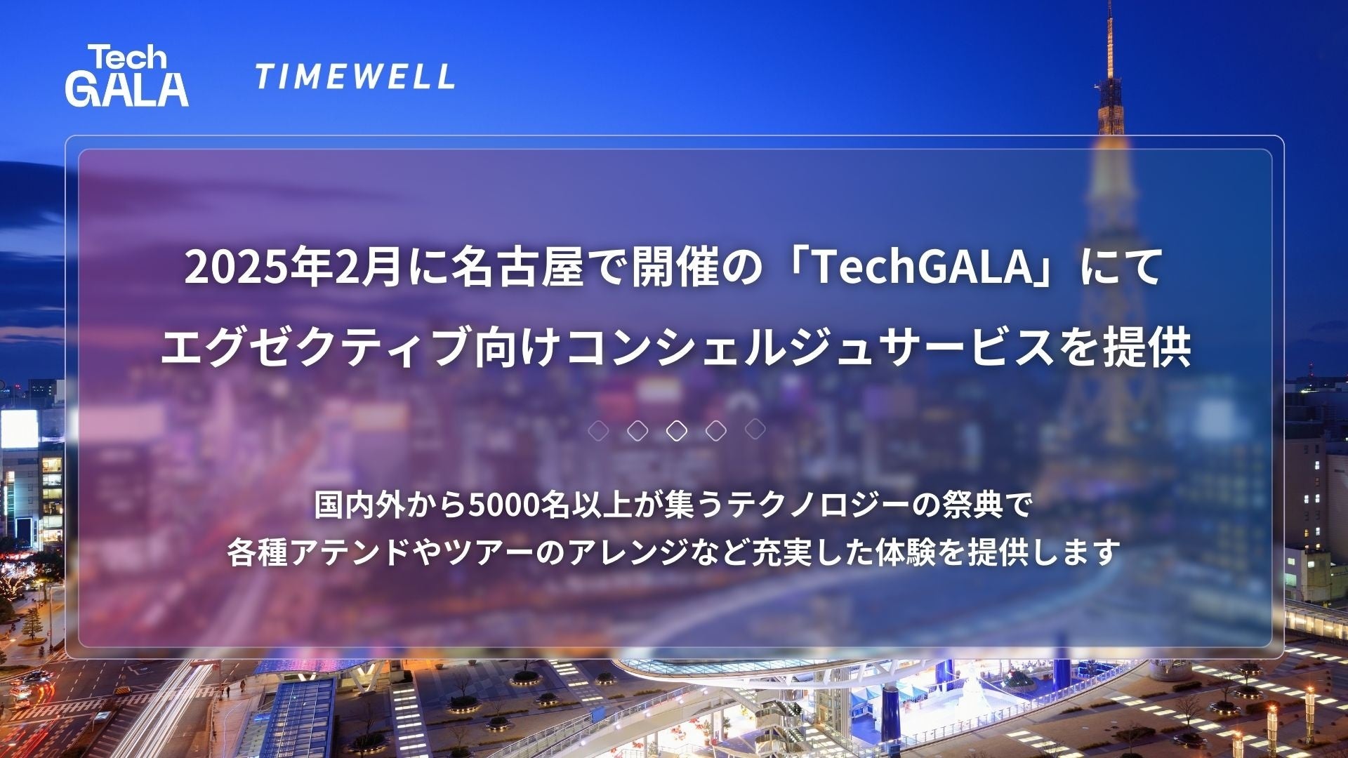 株式会社TIMEWELL(本社:神奈川県横浜市、代表取締役:濱本隆太、以下TIMEWELL)は、2025年2月4日(火)~6日(木)に愛知県名古屋市栄地区で開催されるテクノロジーの祭典『TechGALA』のエグゼクティブ向けコンシェルジュサービスの提供を開始することをお知らせいたします。