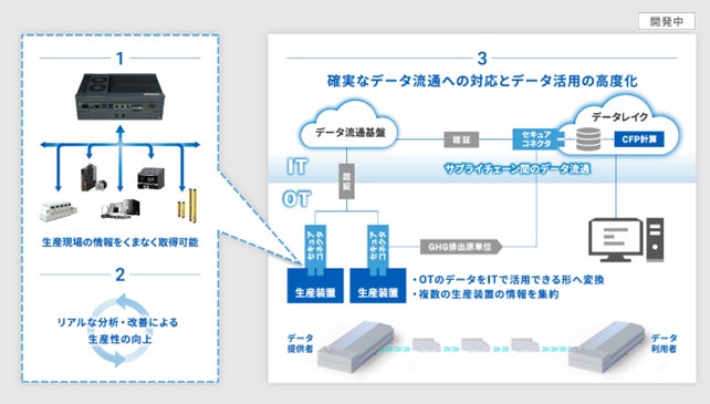 目的 | ・CFP算出に必要な生産現場データ収集の自動化検証および算出・改善支援ツールの確立 ・グローバルデータ流通基盤を活用した収集・分析ノウハウの獲得 ・サステナブルなモノづくり現場実現に向けて共創取り組み・参画企業の拡大 |