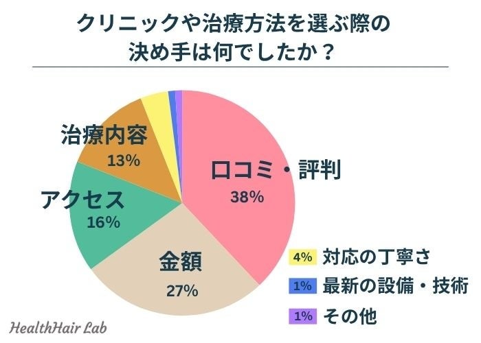 クリニックや治療方法の決め手について伺ったところ、『口コミ・評判(38%)』『金額(27%)』『アクセス(16%)』『治療内容(13%)』『対応の丁寧さ(4%)』『最新の設備・技術(1%)』『その他(1%)』という回答が集まりました。