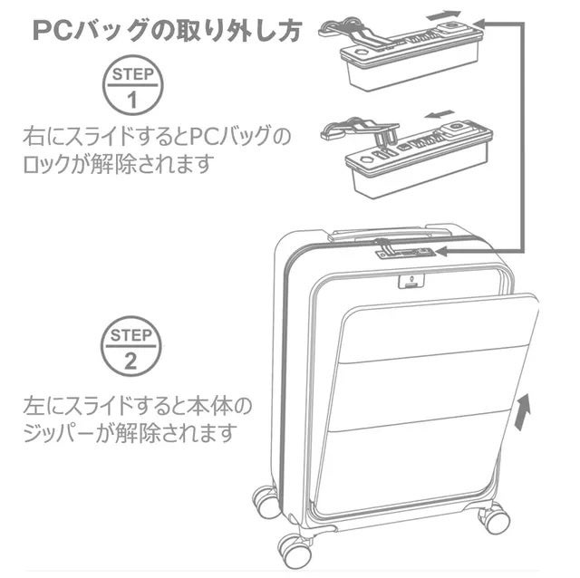 このキャリーケースは、本体からパソコンバックをワンタッチで簡単に取り外すことができます。