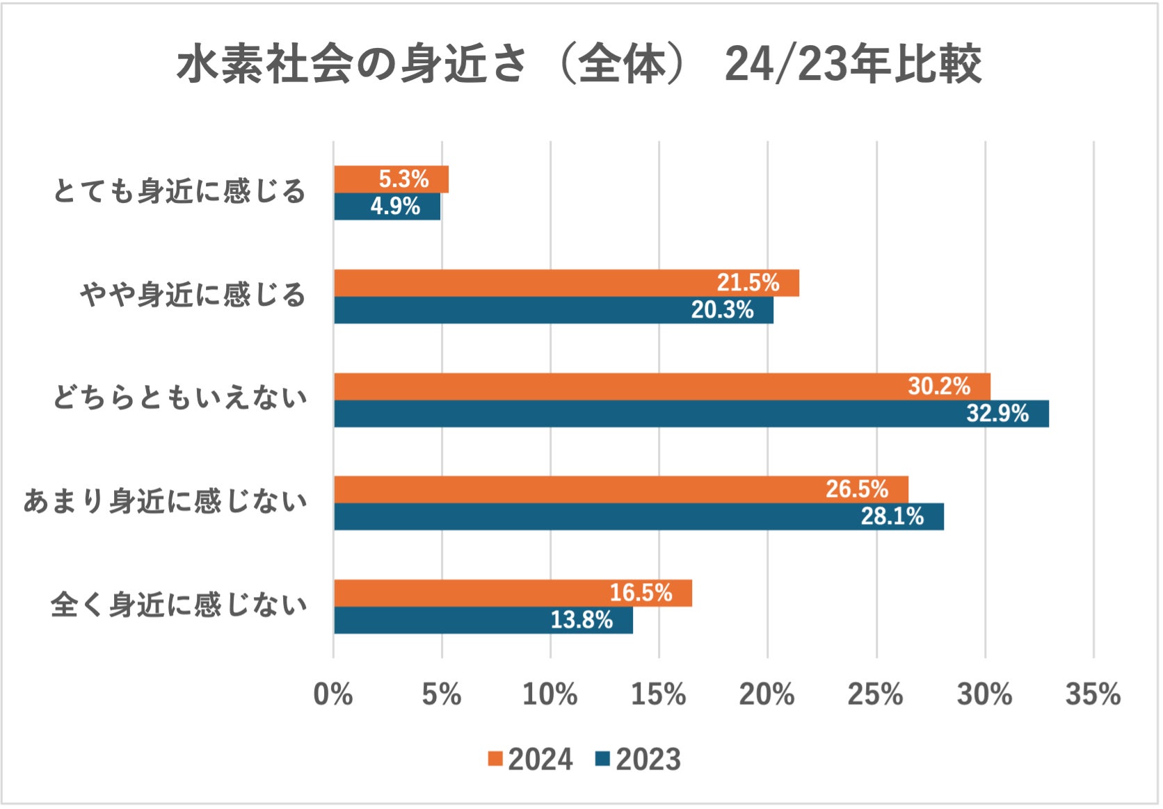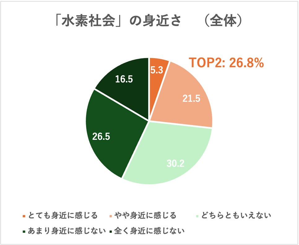 ■水素社会に関する認知やイメージは昨年と同様の傾向で、「水素社会」の認知率は28.9%(29.2%)と横ばいでした。水素社会の身近さについては、「とても身近である」「やや身近である」との回答が26.8%(25.2%)と微増しました。