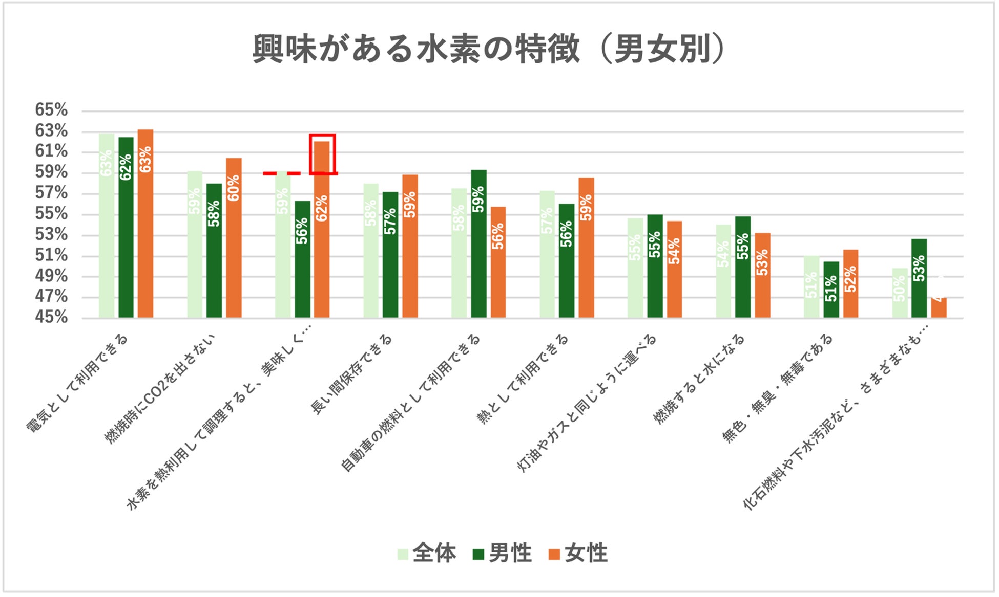 顕著に女性が興味を持っている特徴として「水素を熱利用して調理すると、美味しくなる」が挙げられる。