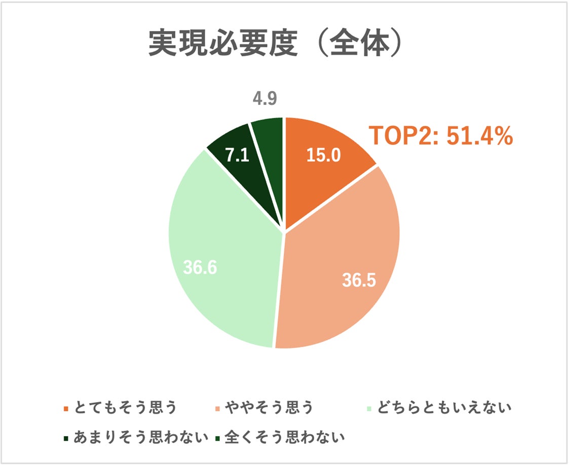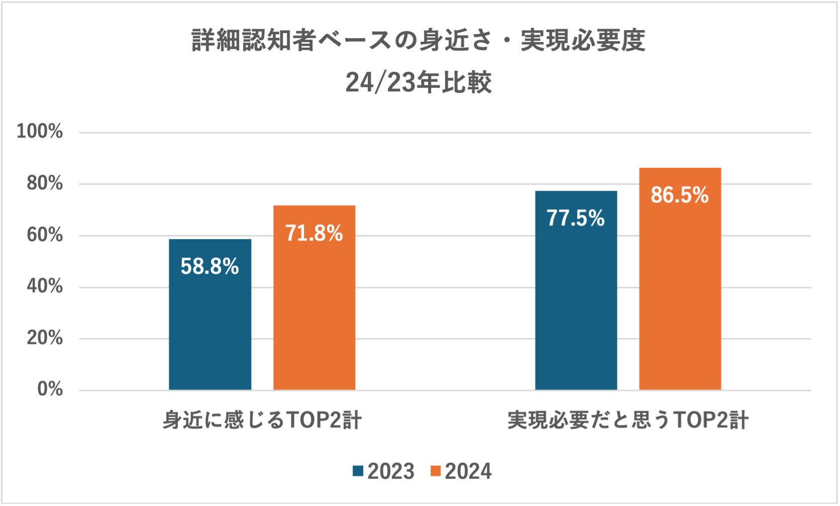 昨年比較で詳細認知者の身近さスコアは+13ポイント、実現必要度は+9ポイント増加していることから、この傾向は昨年よりも強まっていると言える。