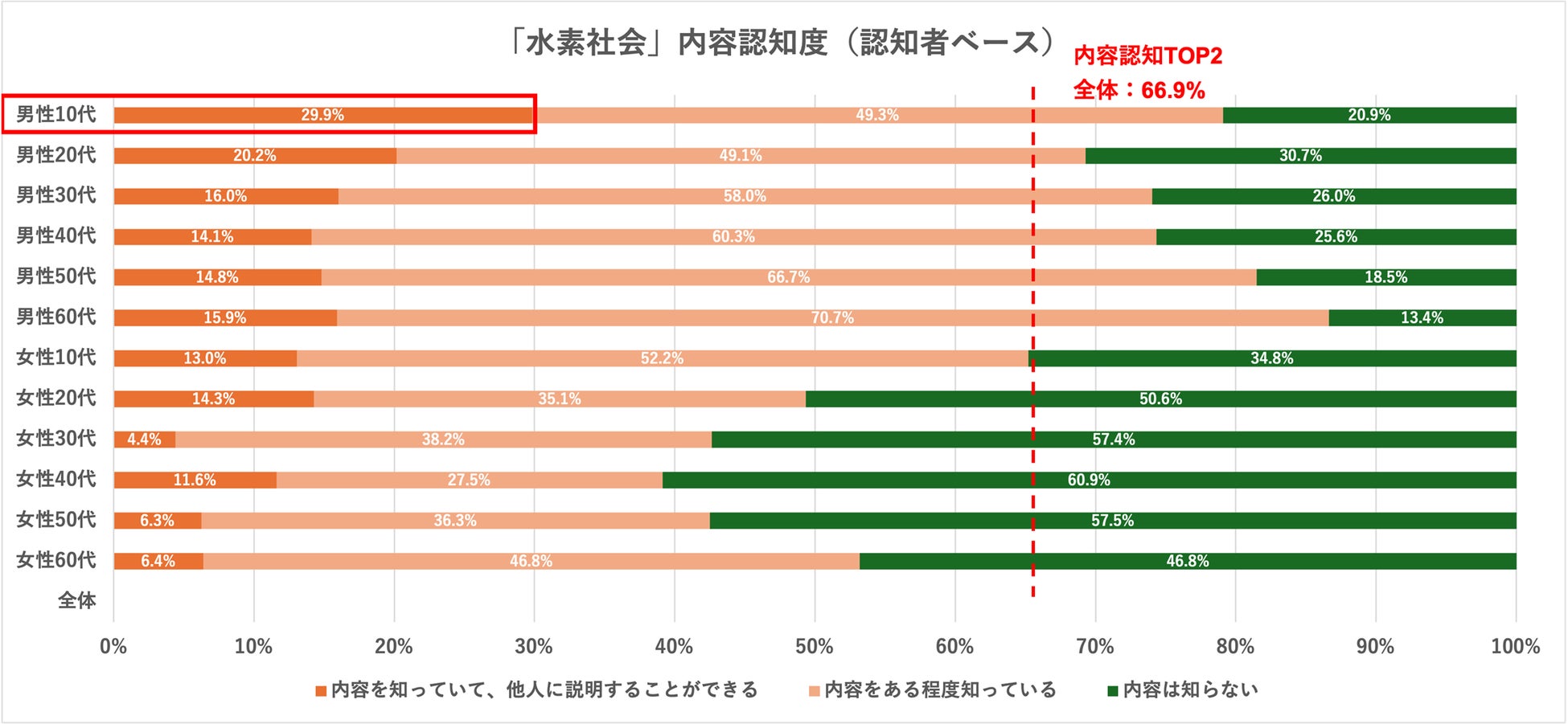 水素社会の内容認知は男性10代が突出して高く、8割が内容を認知しており、そのうち3割が「他人に説明することができる」ほど詳細に認知している。