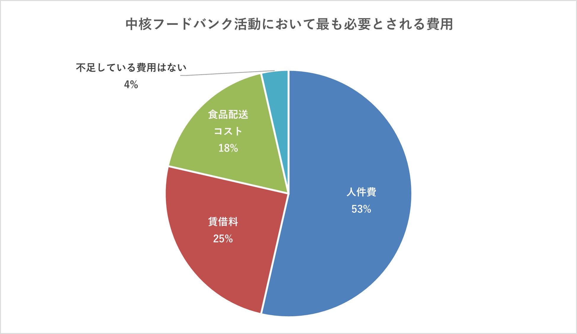 中核フードバンク活動において最も必要とされる費用については、中核フードバンク団体の多くは「人件費」「賃貸料」「食品配送コスト」の順で費用を必要としていることが分かりました。一方で「食品購入費」を必要とする団体は、今回の調査では確認されませんでした。