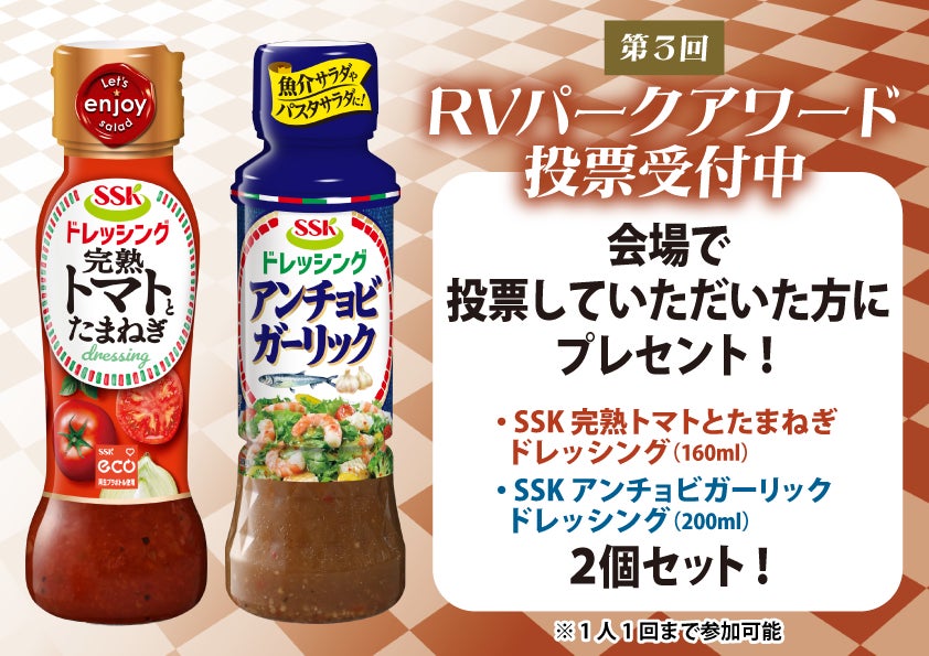 会場で現在開催中の「第3回 RVパークアワード」でお気に入りのRVパークに投票していただいた方へSSKフーズのドレッシング「完熟トマトとたまねぎドレッシング(160ml)」と「アンチョビガーリックドレッシング(200ml)」の2本セットをプレゼント!