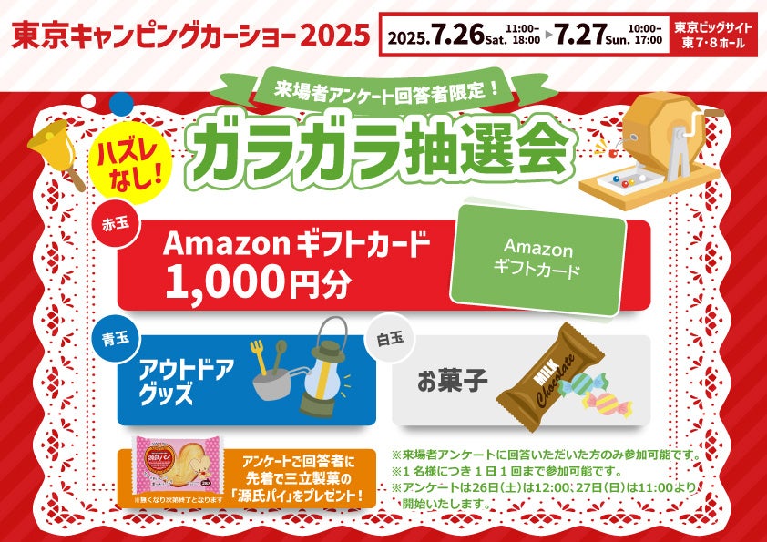 アンケートにお答えいただいた方を対象に、会場内で「ハズレなし」のガラガラ抽選会を実施します。Amazonギフトカード1,000円分、アウトドアグッズなどが当たります!また、先着で挑戦者全員に三立製菓の人気お菓子「源氏パイ」もプレゼントされる特典付きです。
