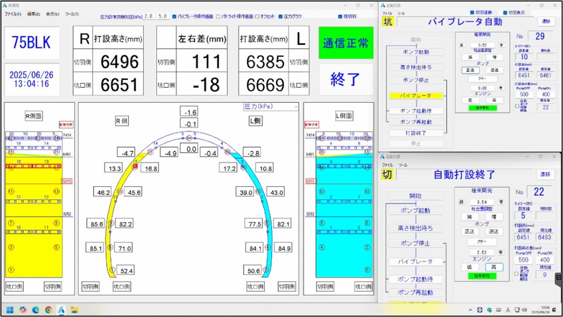 本システムは、当社が開発した「高速打設システム」と「圧力計による打設高さ検知システム」を組み合わせ、これに圧送ポンプ機のリモコンとバイブレータの制御盤を連動させたものです。予め設定した打上がり高さに応じて、ポンプの圧送速度、ポンプとバイブレータの稼働・停止を自動制御することにより、覆工コンクリートの打設を、打設口の切り替え作業を除いて自動で行うことができ、技能労働者の省力化・省人化が図れます。また、定量的なデータに基づき打設作業(ポンプ圧送、締固めなど)が行われるので、技能労働者の熟練度に依存することなく、安定した品質を確保できます。現場適用前に当社の技術研究所において実大規模の施工実験を行い、本システムの有効性を確認しました。
