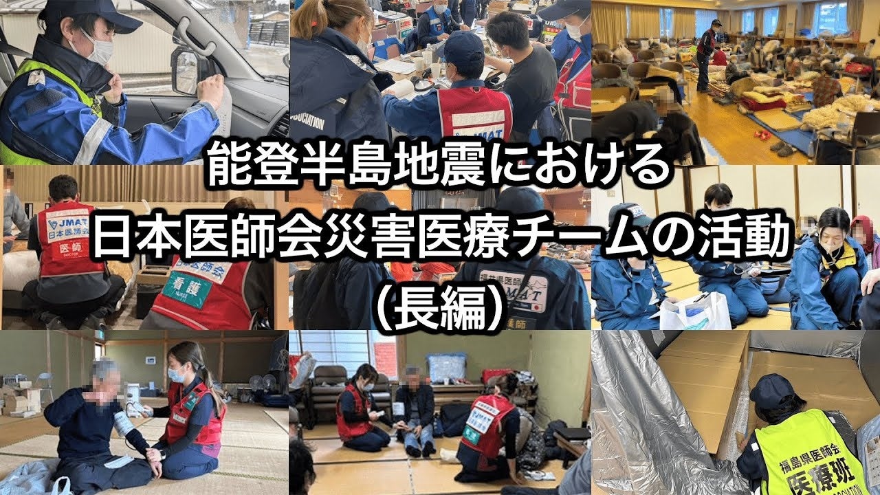 日本医師会ではこの他にも、令和6年能登半島地震に関連した動画として、松本吉郎会長と安田健二石川県医師会長との対談の模様を収録した動画や、日本医師会が都道府県医師会の協力の下に組織し、被災地に派遣した日本医師会災害医療チーム(JMAT)の活動を紹介した動画(長編、短編)なども制作しています。日本師会公式YouTubeチャンネルに掲載しておりますので、併せてご覧頂ければ幸いです。
