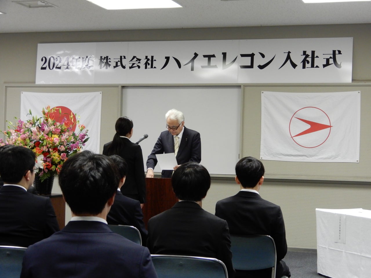 2024年4月1日(月)、株式会社ハイエレコン本社にて、2024年度新卒入社式が執り行われました。上田康博社長をはじめとする経営陣の挨拶のもと、17名の新入社員が会社に加わりました。新入社員たちは緊張と意気込みとを感じさせる面持ちで、新社会人としての第一歩を踏み出しました。