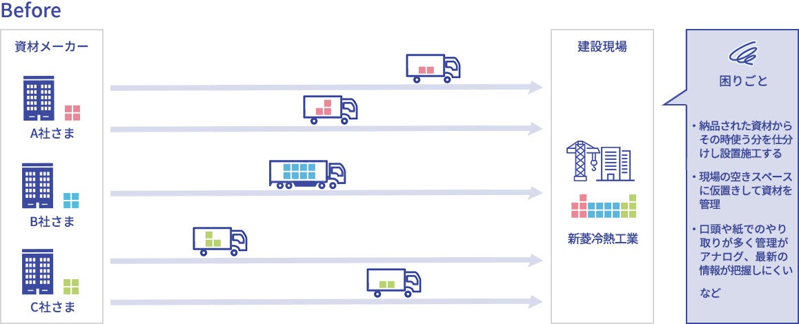 こうした状況を打開するため、これまでの知見やノウハウを生かした包括的なアプローチを提示。建設現場に適した解決策として、門前倉庫と資材管理システムを中核とするこのソリューションを新菱冷熱工業に採用いただきました。