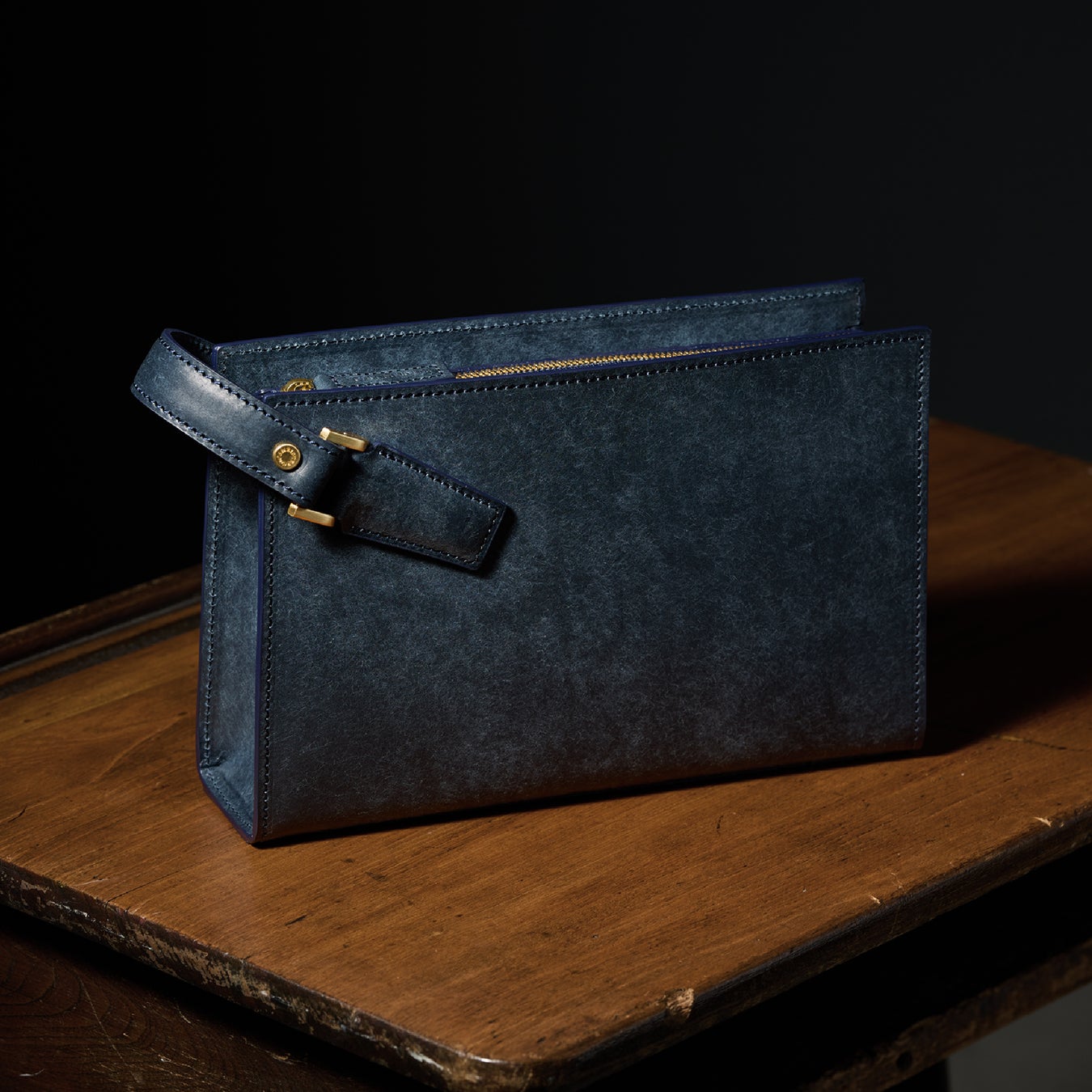 砂金を抽出する時に使用する水をイメージしたウォーターウォッシュ。深みのある落ち着いた青色が魅力、表裏の統一感がお洒落です。経年変化すると深い青色へ変化します、艶が大幅に増しますので、とても高級感があり上品です。