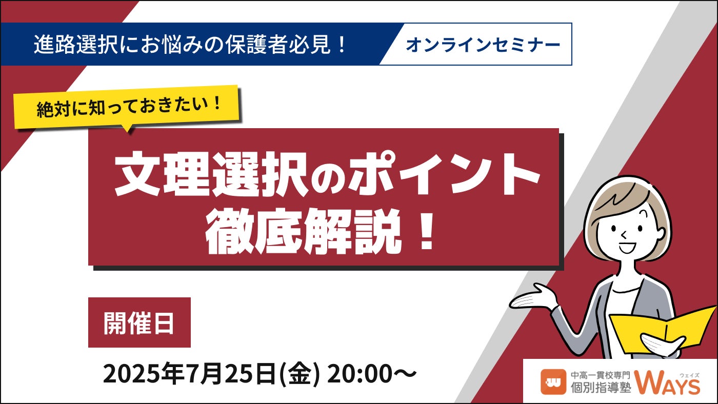 別指導塾WAYS(以下、WAYS)』は、2025年7月25日(金)の20時より「絶対に知っておきたい!文理選択のポイント徹底解説セミナー」を開催いたします。