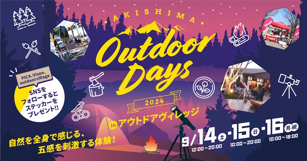 総合光学機器メーカー株式会社ビクセン(本社:埼玉県所沢市、代表取締役:新妻和重)は、2024年9月14日(土)~16日(月・祝)の3日間にわたり、東京都昭島市の複合商業施設「モリパーク アウトドアヴィレッジ」にて、アウトドアをテーマにした体験型イベント『AKISHIMA Outdoor Days 2024』を開催します。