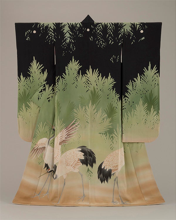昭和5年(1930)に小大丸で調製された友禅染の婚礼衣装です。大阪人の好みに沿った《はんなり》とした図様は、円山応挙の鶴図を写したといいます。友禅独特の暈(ぼ)かし込みの技法を活かして染められた鶴図がじつに見事です。それに対して背景は黒と緑のグラデーションを組み合わせた抽象的な草木を配置し、鶴の写実性を引き立てる絶妙な仕上がりとなっています。