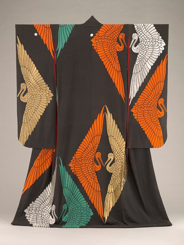 戦時中の昭和17年(1942)に呉服商・小大丸こと白井家に輿(こし)入れした女性の婚礼衣装で、鶴を大胆にアレンジした《粋》(すい)な一領となっています。ほかに紅白梅図振袖や三枚襲(さんまいがさね)の婚礼衣装も持参しています。戦時中は国民服や婦人標準服の導入、衣服切符の配布などの統制が行われていましたが、老舗呉服商への輿入れにふさわしい婚礼衣装を調えたことが伺えます。
