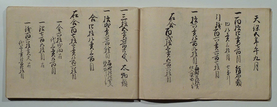 小大丸を経営した白井家の祖・大和屋忠三郎は、明和元年(1764)に大坂で古着商・大和屋として開業、天明5年(1785)には心斎橋筋へと進出しました。この資料は半年ごとに行われた大和屋の資産の決算帳簿で、天保5年(1834)9月のものです。