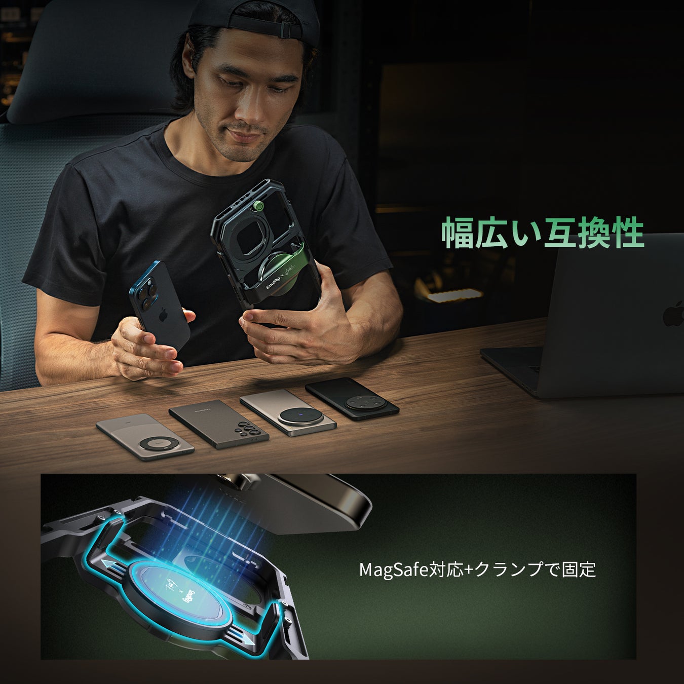 MagSafe磁気で吸着ことまたはクランプを利用することで、iPhoneでもAndroidスマホでも簡単にケージを装着できます。