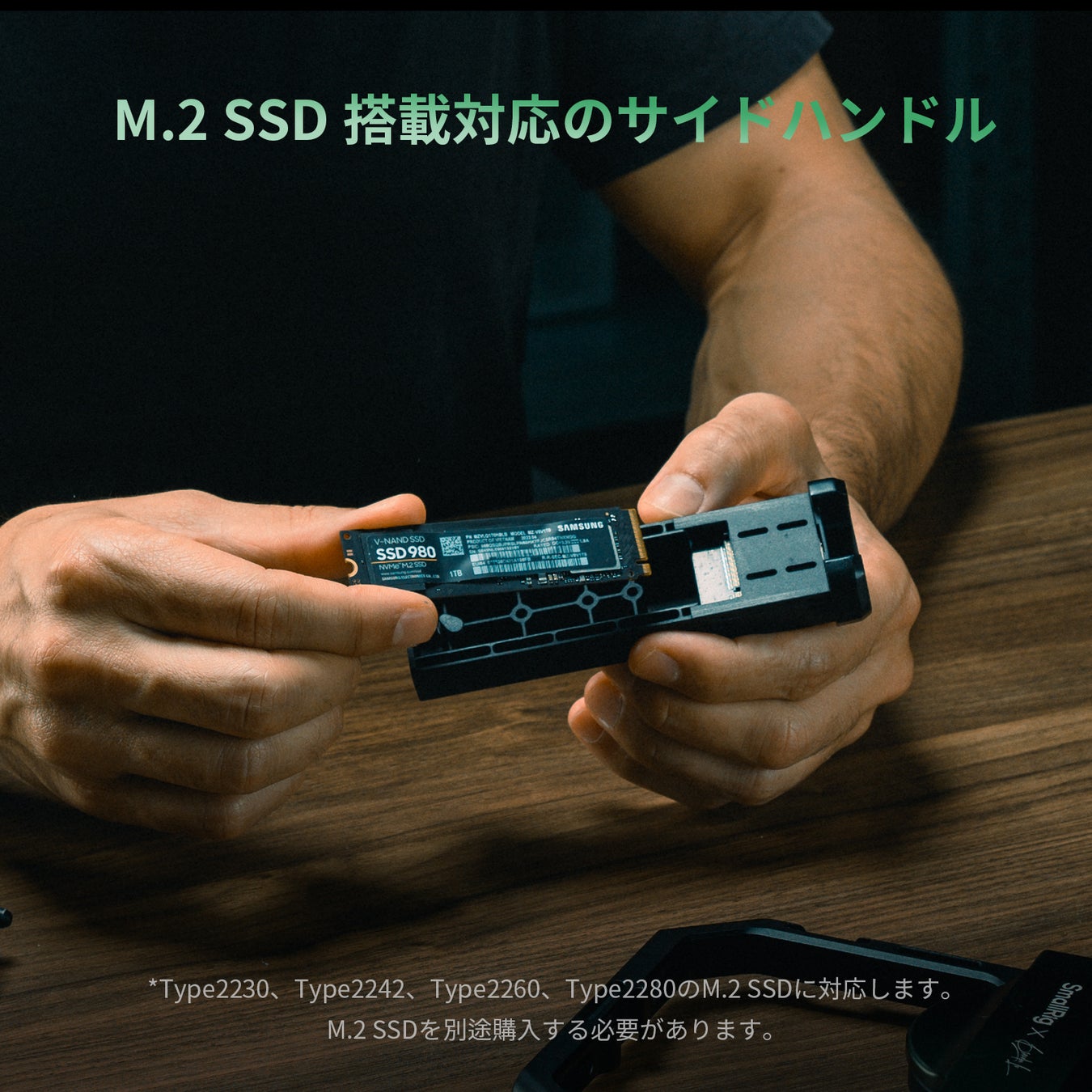 360度回転可能なサイドハンドルは、Type2230、Type2242、Type2260、Type2280のM.2 SSDの搭載に対応し、スマホによる「ProRes」4K動画の録画に対応しています。また、分離合体可能なワイヤレスコントローラーは、リモートでの撮影、フォーカス、ズームイン/アウトなどの操作をサポートします。