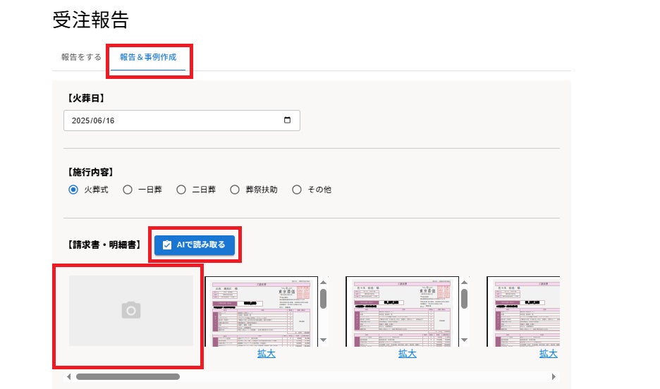 事例自動登録機能:請求書データから、葬儀の事例を自動作成