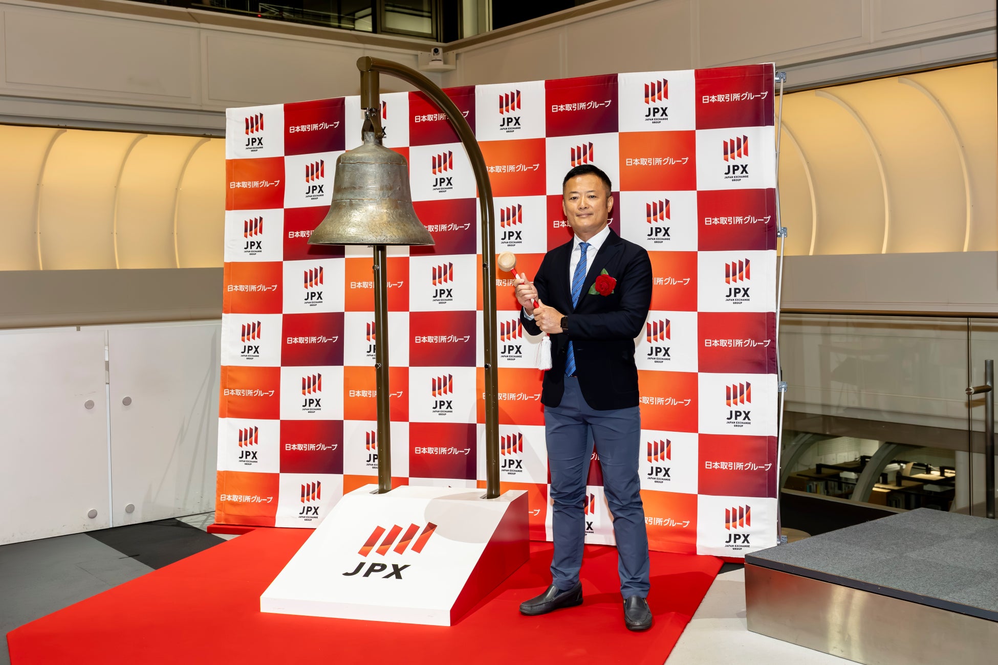 上場日には東京証券取引所にて上場セレモニーが執り行われ、インフルエンサーとしてもご活躍されているエモリファンドマネジメント株式会社代表取締役の江守哲氏をゲストとしてお迎えしました。
