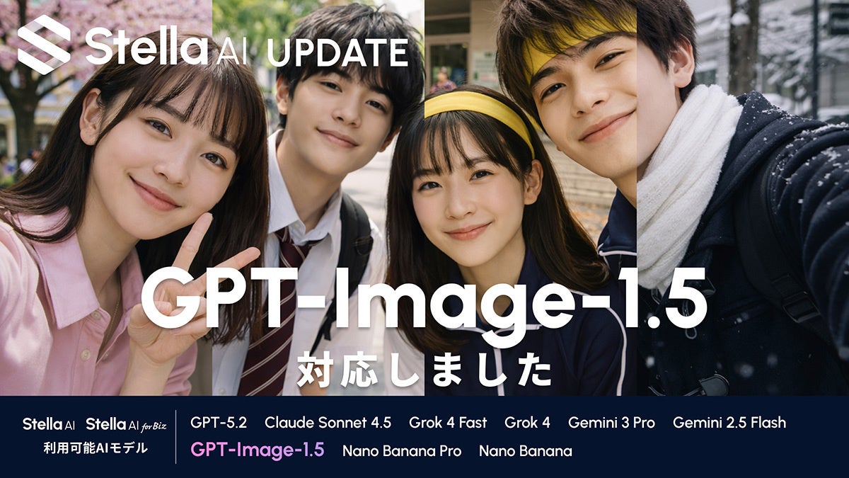 生成AIサービス開発を⼿掛ける株式会社SUPERNOVA(本社:東京都港区 代表取締役社長 木本 東賢 以下、当社)は、当社の生成AIサービス「Stella AI」および「Stella AI for Biz」において、OpenAI社の最新画像生成AIモデル「GPT-Image-1.5」への対応を2025年12月18日(木)より提供開始します。