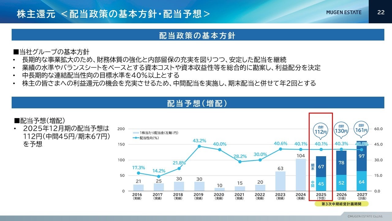 2025年12月期の配当金は、1株当たり112円(中間45円/期末67円)配当性向40.1%を見込んでおります。