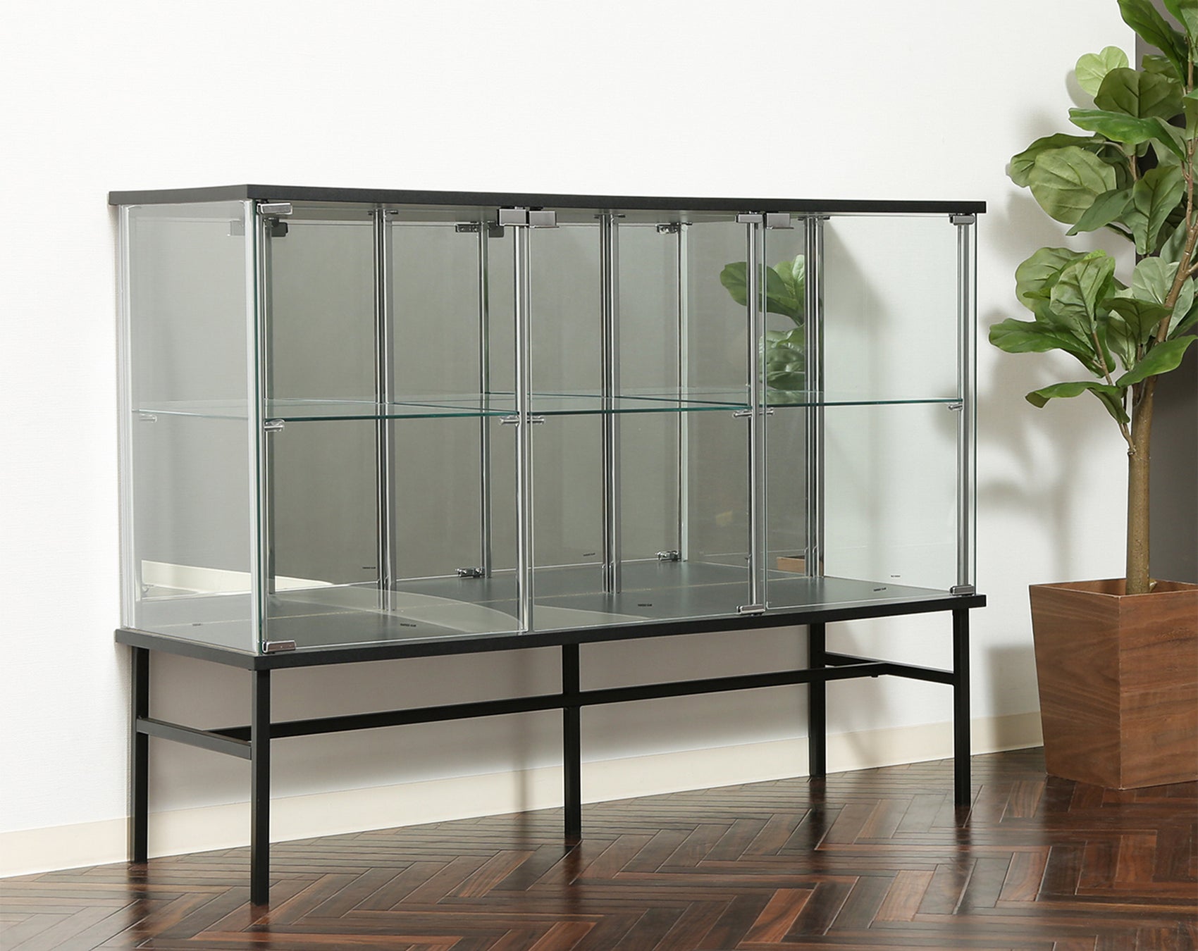 従来の縦型とは異なり、横幅の広いデザインが注目を集めました。スリムな脚部が圧迫感を軽減し、ショップのような洗練された雰囲気で高級感のあるディスプレイをお楽しみいただけます。