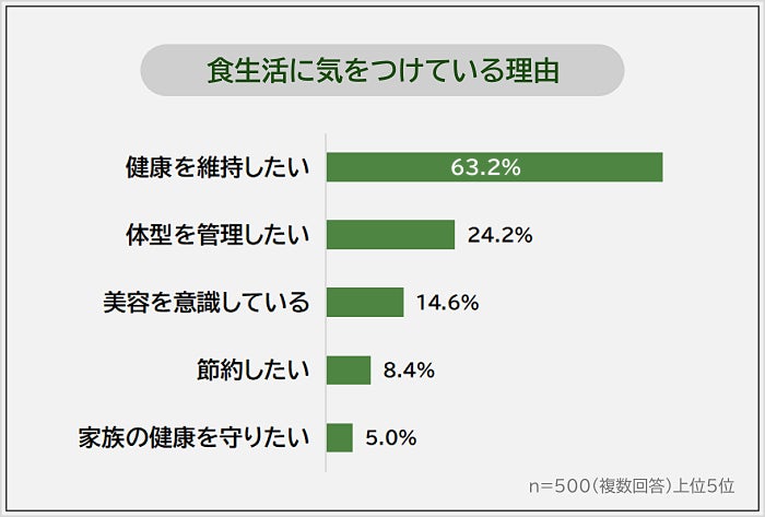 食生活に気をつけている理由の圧倒的な1位は「健康を維持したい(63.2%)」でした。2位「体型を管理したい(24.2%)」、3位「美容を意識している(14.6%)」が続きます。