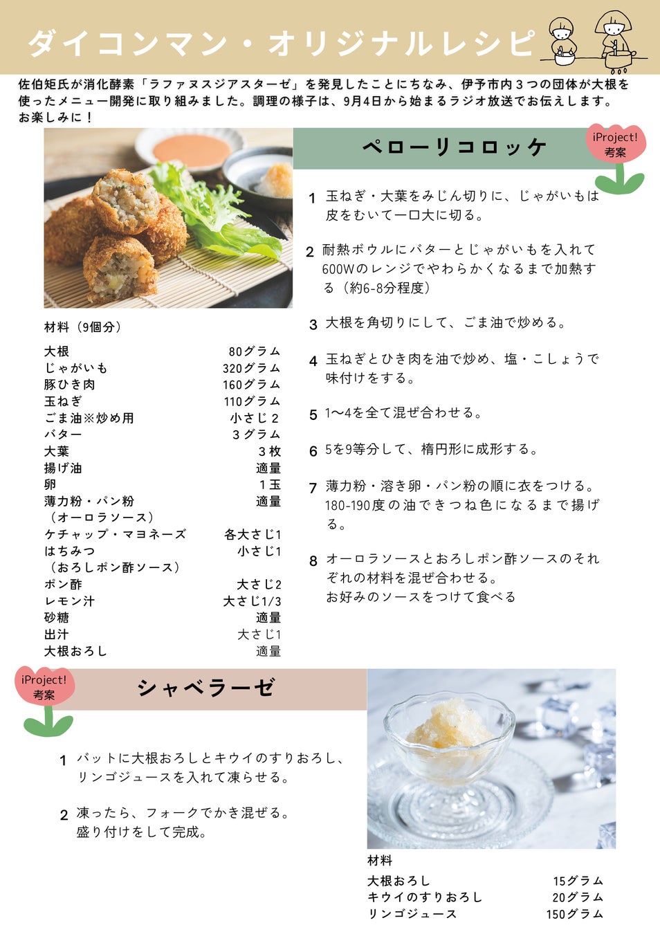 本企画では、伊予市内を中心に活動する3つの団体と協力し、味も見た目もユニークな「大根レシピ」が誕生!これらのレシピは、ラジオドラマ内の「ダイコンマン・オリジナルレシピ」コーナーにて紹介されます。