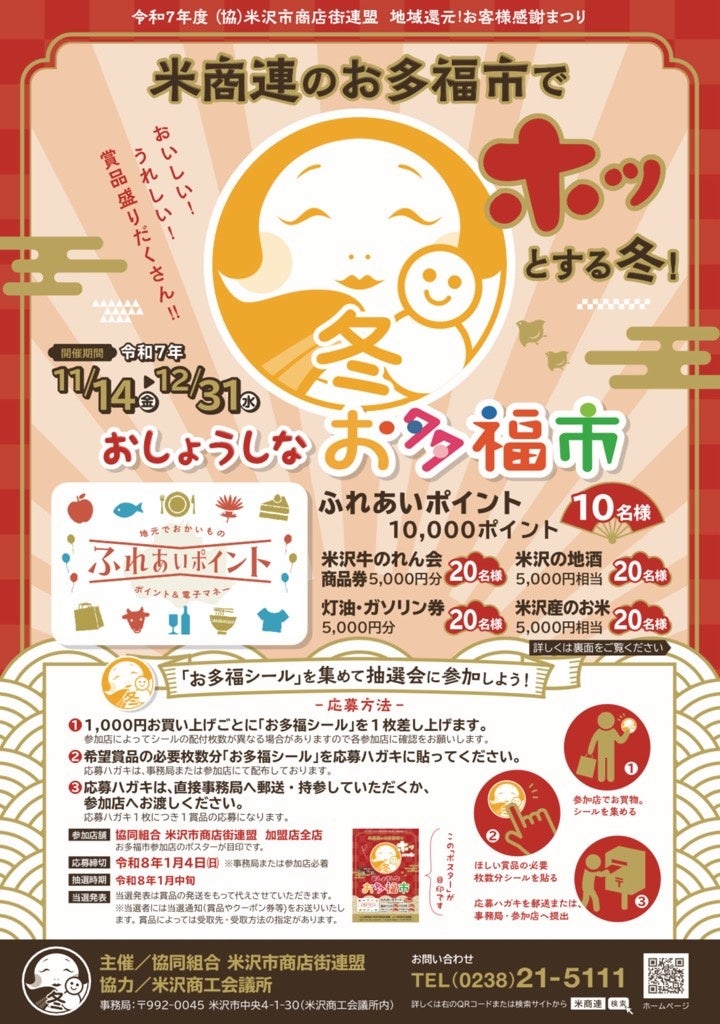 米沢市商店街連盟 加盟店でのお買い物をお楽しみいただき、「お多福シール」を集めると、豪華賞品が当たる抽選会にご参加いただけます🎊✨
