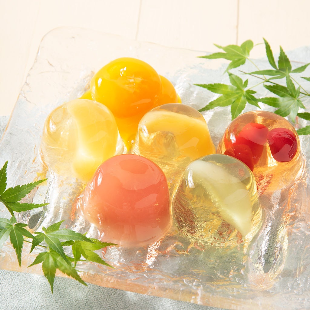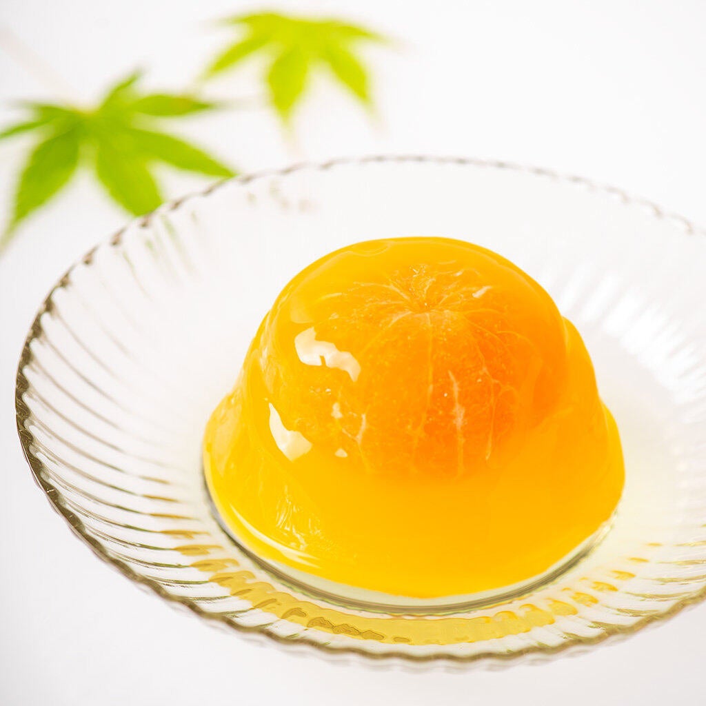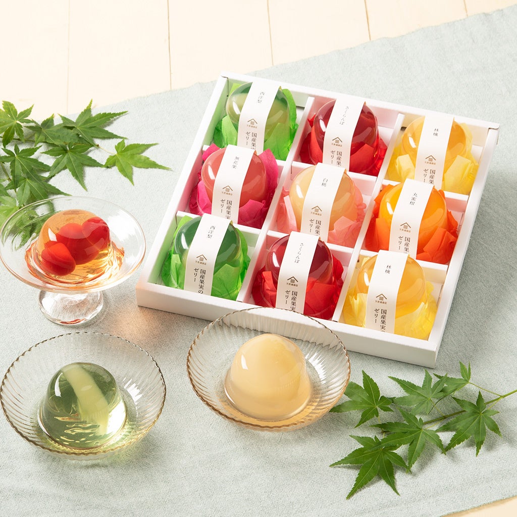 さくらんぼ×2、林檎×2、西洋梨×2、丸蜜柑、白桃、いちじくの 計9個の国産果実ゼリー の詰め合わせです。1番人気は丸蜜柑の果実ゼリー。和歌山県産の温州みかんを、ごろっと丸々1個贅沢に使用しました。