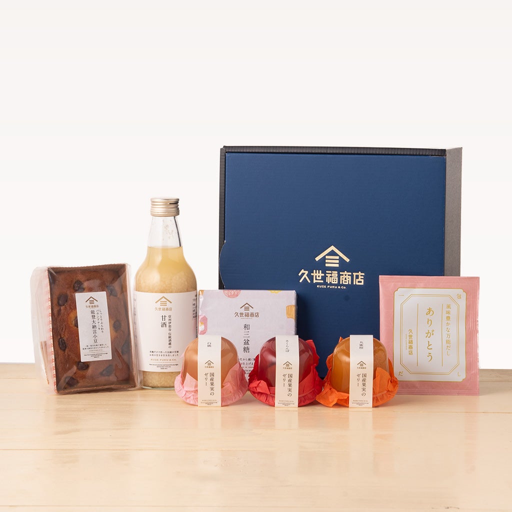 甘酒、国産果実入りフルーツゼリー(白桃、丸蜜柑、さくらんぼ)、和三盆糖、しっとりパウンドケーキ、ありがとう一包だしを詰め合わせた華やかなギフトセットです。