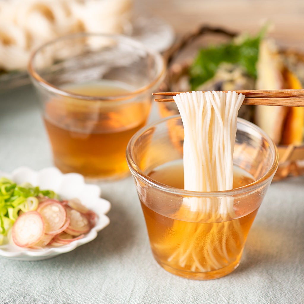 職人さんの手作業によって丁寧に延ばされたそうめん。機械では決してだせないコシとのど越しがたまりません。