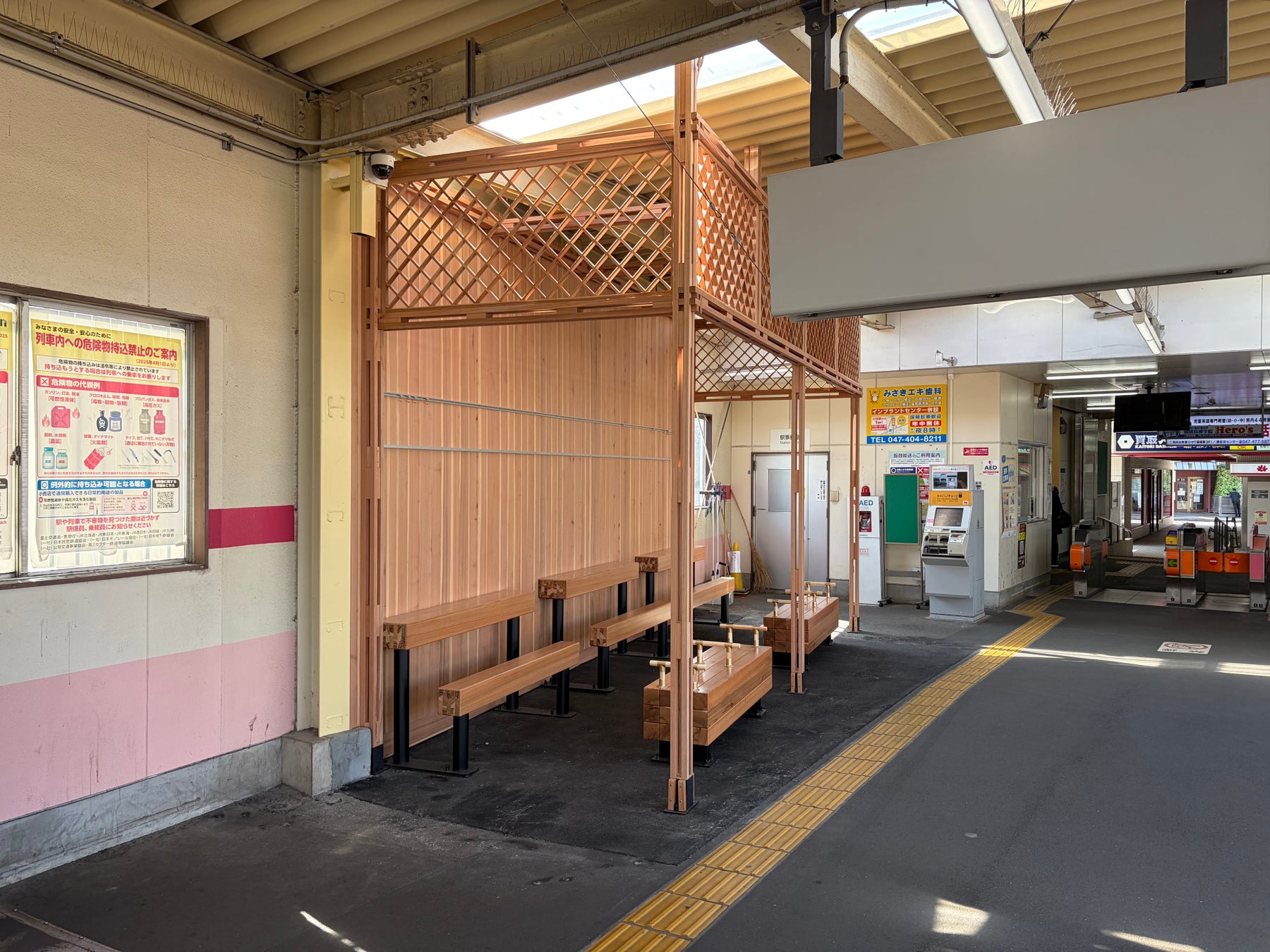 二和向台駅改札内に、千葉県の「ちばの木ふれあい空間創出事業」を活用し、当社として初めて千葉県産の木材を使用した待合スペースを設置しました。ご利用のお客様にやすらぎの空間を提供するとともに、千葉県産木材の利用促進を通じて森林の健全な育成を支援いたします。