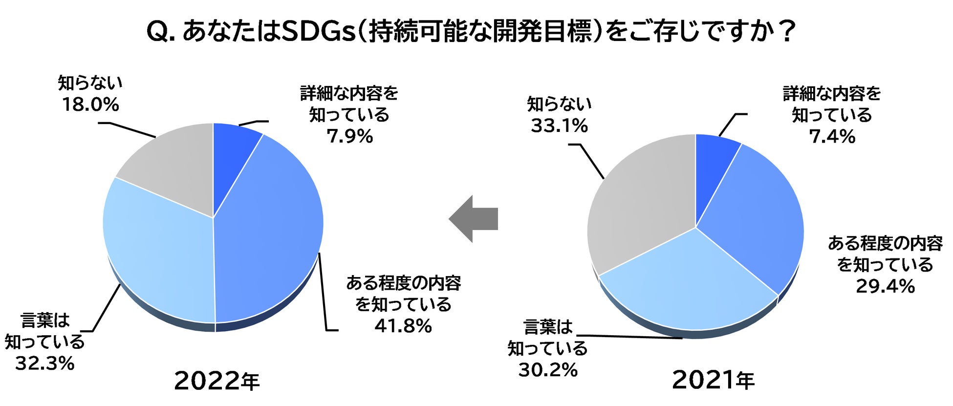 「言葉は知っている」との回答も前年より増えており、SDGsの認知度は確実に高まってはいるが、詳細な内容まで知っている人が増えているわけではなく、今後はいかにして詳細な内容までの周知を広め、具体的な活動につなげていくかが課題であることが明らかになった。