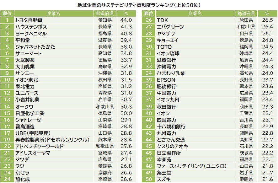 地域企業のサステナビリティ貢献度、1位はトヨタ(愛知)、2位ハウステンボス(長崎)
