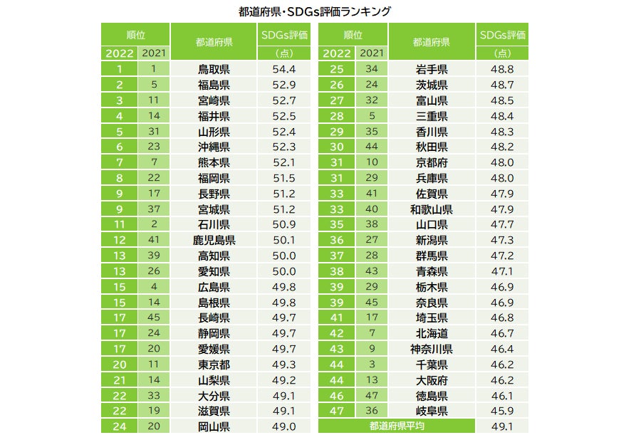 2位は福島県で、3位は宮崎県、4位は福井県、5位は山形県となりましたが、いずれの県もランキングの順位が前年の5位、11位、14位、31位からの大幅に上昇しています。6位以下の都道府県においても順位が大きく変化しているケースが多く、SDGsの取り組み自体が急激に浸透している現状において、地域における評価も、その取り組み内容で大きく変わる可能性があることがわかります。