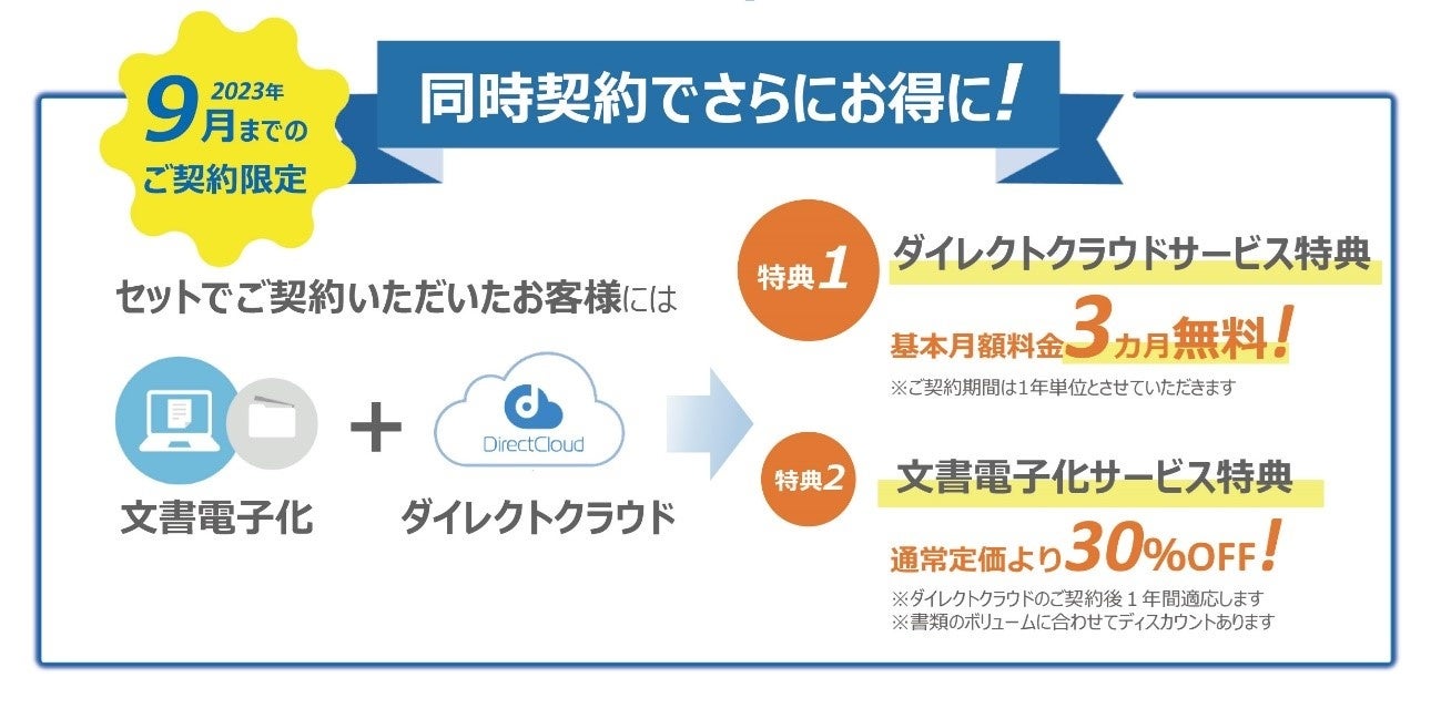 法人向けクラウドストレージ「DirectCloud」を同時契約することで特別割引を受けられるキャンペーンです。