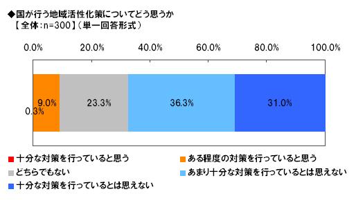 中小企業経営陣300名に対し、国が行う地域活性化対策について関心があるかどうかを尋ねたところ(単一回答形式)、約6割の回答者が「関心がある」(「関心がある」28.0%と「やや関心がある」31.3%の合計)と回答しました。次に、国が行う地域活性化対策について、どのように考えているかについて回答を求めたところ(単一回答形式)、「十分な対策を行っていると思う」0.3%、「ある程度の対策を行っていると思う」9.0%、「どちらでもない」23.3%、「あまり十分な対策を行っているとは思えない」36.3%、「十分な対策を行っているとは思えない」31.0%となり、半数以上の中小企業経営陣が、国が行なっている地域活性化対策は「不十分である」と考えていることが明らかとなりました。