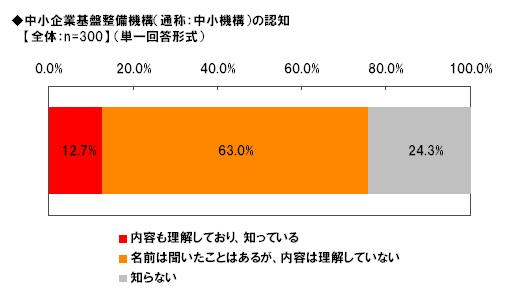 中小企業経営陣300名に対し、「地域活性化支援事務局」も運営する中小企業基盤整備機構(通称:中小機構 ※以下、中小機構)を知っているかどうかについて尋ねたところ、「内容も理解しており、知っている」12.7%、「名前は聞いたことがあるが、内容は理解していない」63.0%、「知らない」24.3%となり、中小機構の認知率は75.7%で比較的高い数字となりましたが、実際の業務内容への理解はあまり浸透していないことがわかりました。