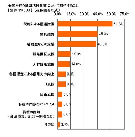 さらに、国が行う地域活性化対策についてどのようなことを期待するのかを複数回答形式で尋ねたところ、トップになったのは「税制による優遇措置」61.3%、次に「低利融資」45.0%、「補助金などの支援」43.3%が続く結果となり、資金面での支援が強く求められていることが明らかとなりました。
