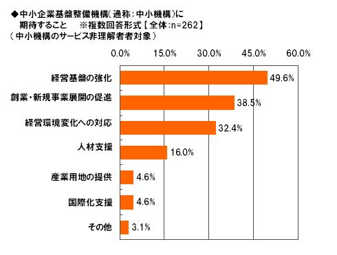 次に、中小機構のサービスの非認知者262名に対し、中小機構の説明を行った上で、どのようなことを中小機構に期待するのかを聞いたところ、1位「経営基盤の強化」49.6%、2位「創業・新規事業展開の促進」38.5%、3位「経営環境変化への対応」32.4%となり、中小機構による、企業経営に関する専門的なアドバイスが必要とされていることがわかりました。