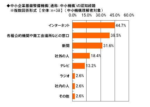 また、中小機構のサービスの認知者38名に対し、認知経路を複数回答形式聞いたところ、1位「インターネット」44.7%、2位「各種公的機関や商工会議所などの窓口」39.5%、3位「新聞」31.6%という結果になりました。
