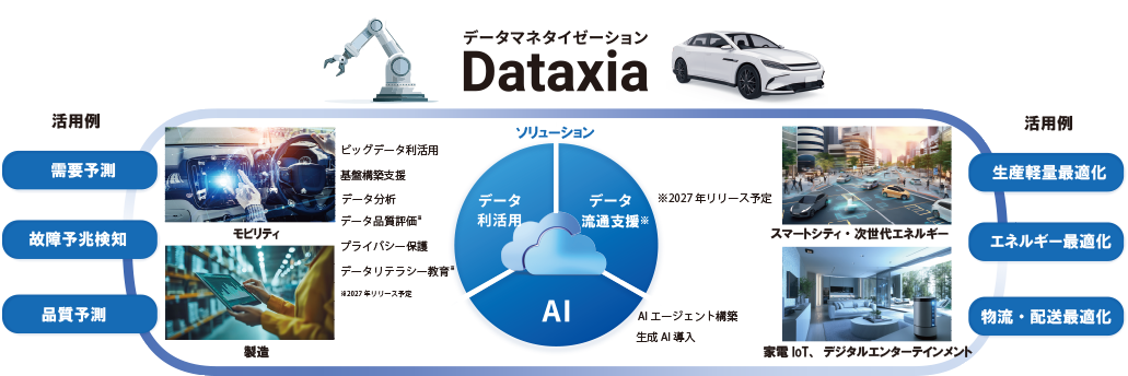 『Dataxia』は、ビッグデータ分析などの「データ利活用ソリューション」、AIエージェント活用のデータ利活用基盤を構築する「AIソリューション」、企業・産業間を越えたデータ流通により価値創出を支援する「データ流通支援ソリューション」の3つで構成されており、企業のデータに基づく経営判断や業務改善だけでなく、新たなビジネスの創出や組織課題の解決を支援します。