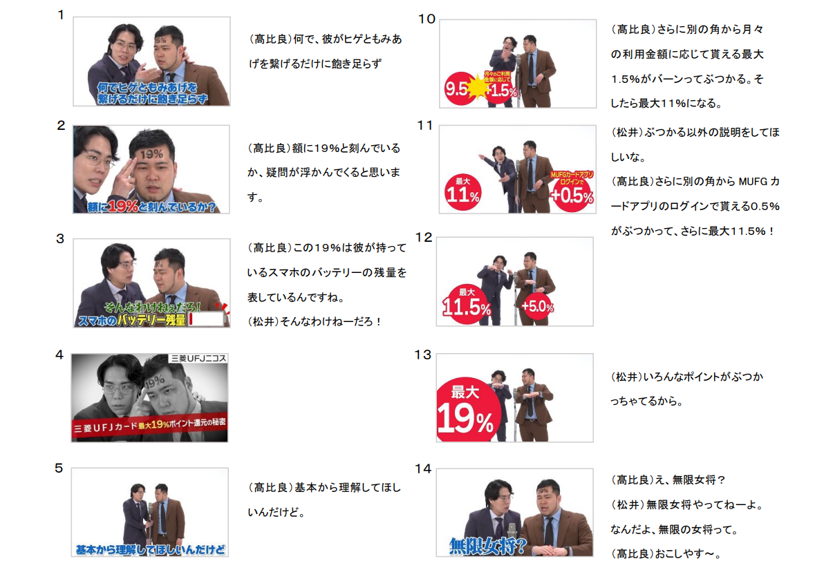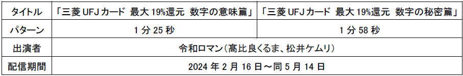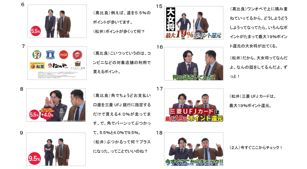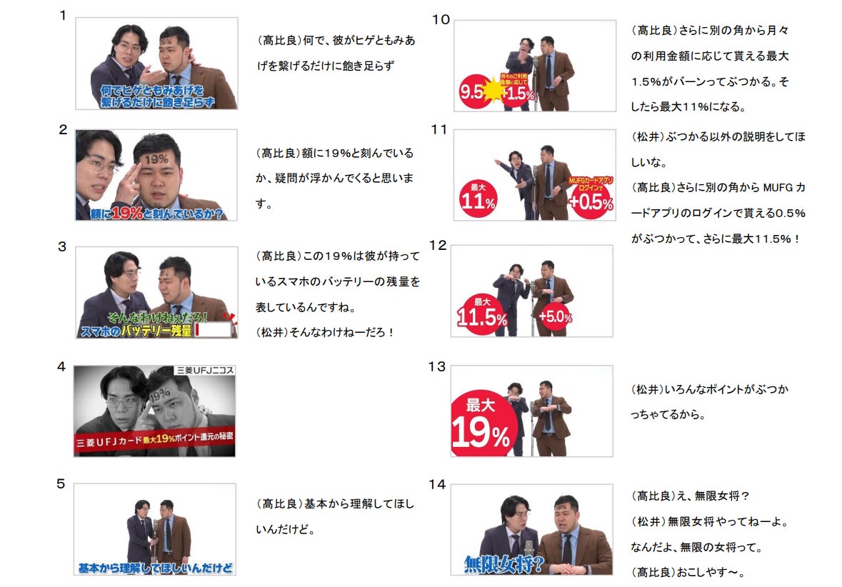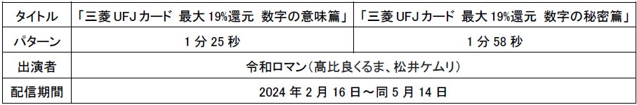 両篇では2月1日から開催中の、ポイント優遇加盟店での三菱UFJカードの利用と対象サービスの登録・利用等に応じて最大19%相当(※1)のポイントが貯まる企画(※2)のお得感を“令和ロマン”ならではの漫才で紹介。「数字の意味篇」では「最大19%」の高い還元率を、「数字の秘密篇」ではその具体的な特典内容をそれぞれ説明するもので、両篇を通して三菱UFJカードでお得にポイントが貯まることを訴求するものです。