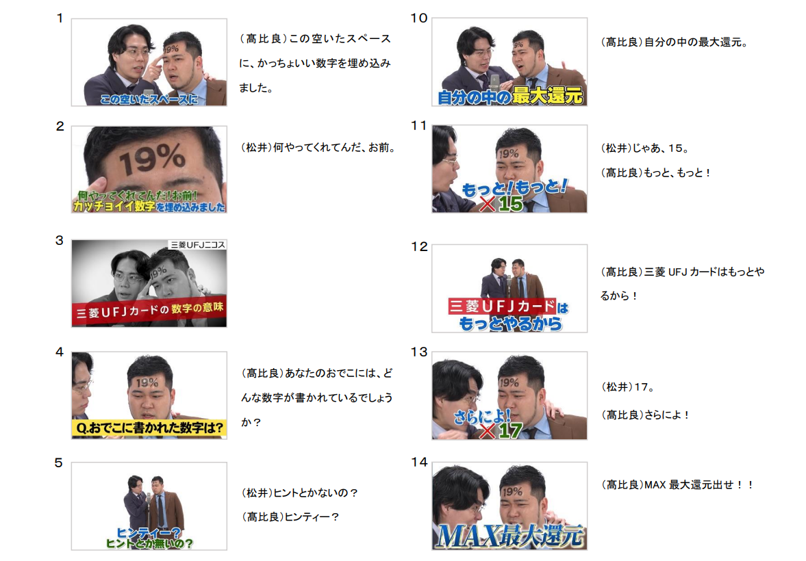 漫才冒頭、なぜか松井さんの額に書かれた“19%”の文字。気付いていない様子の本人に髙比良さんがどんな数字が書かれているかと問いかけます。戸惑う松井さんをよそに「還元して!」と突然叫ぶ髙比良さん。慌てて松井さんが「10」と答えるも「違う、もっと還元!」と煽ります。その後もなかなか「19」に辿りつかない状況に髙比良さんは「もっと、もっと!三菱UFJカードはもっとやるから!さあ来い、来い!」「マックス最大還元出せ!」などとエスカレート。ようやく「19」を言い当てた松井さんに「で、この数字は何なの?」と問われ「これは『対象店舗で三菱UFJカードを使うと最大19%ポイント還元される』の“19”でした」と一変して冷静に説く髙比良さん。乱高下する髙比良さんのテンションと、最後に「詳しく教えて」と“19%還元”に興味津々な松井さんのちゃっかりしたツッコミは必見です。
